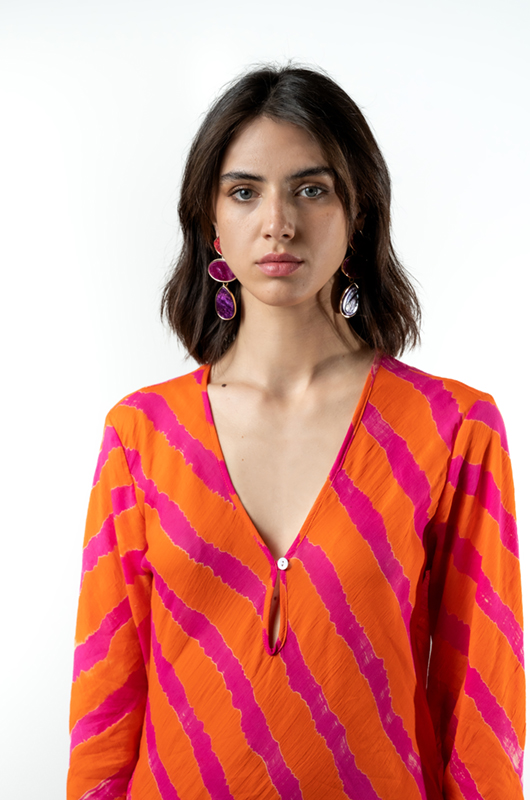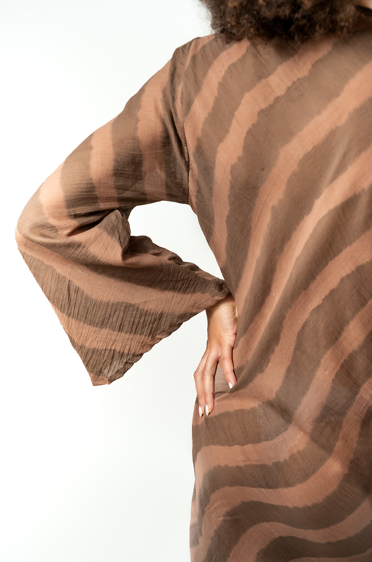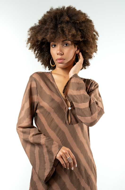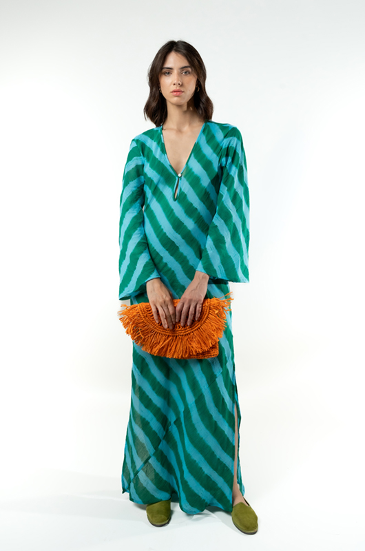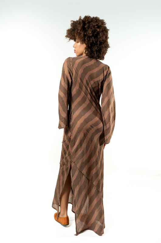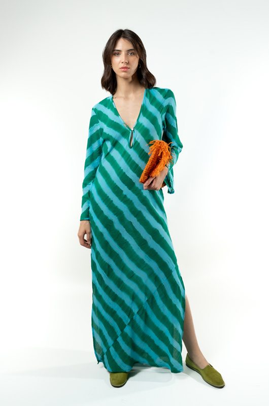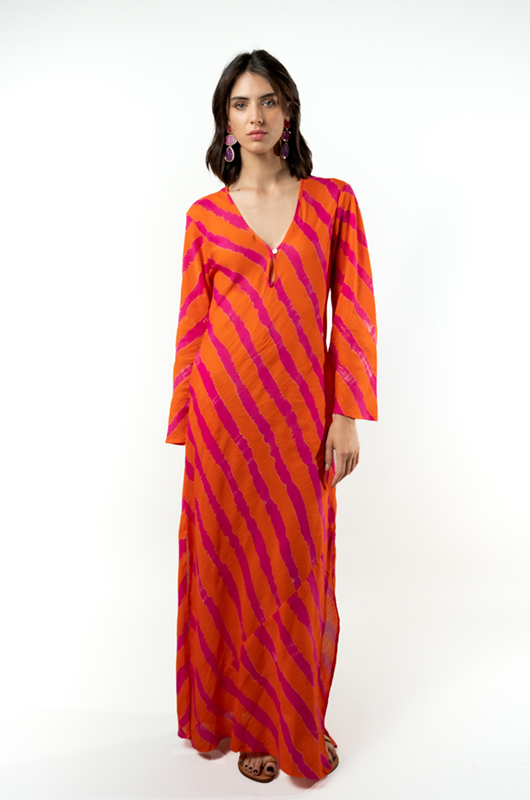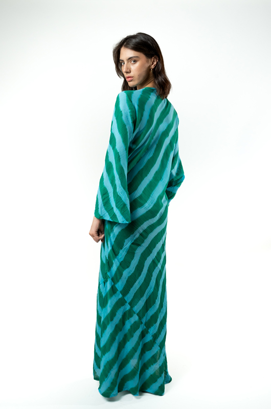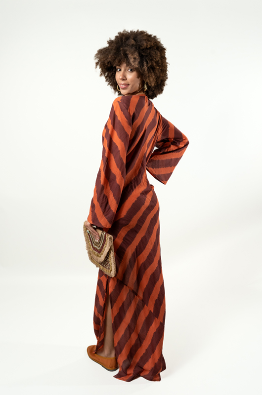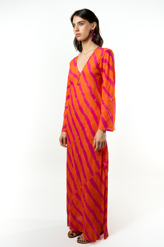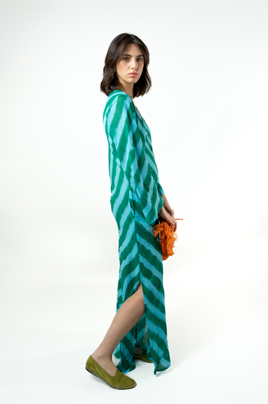 The Levanzo caftan maxi dress is designed for sun-soaked resort days or carefree barefoot evenings, sipping cocktails on the beach. Available in green, brown, pink, or orange, it features a soft tie-dye pattern in diagonal stripes.