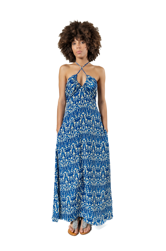 Long halter dress with convertible neckline, deep open back and relaxed A-line shape.