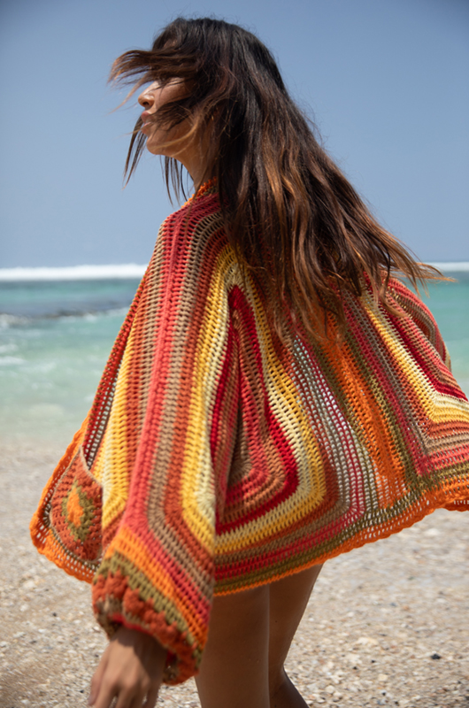 This handmade crochet cardigan is the perfect layering piece to pair with a simple summer dress, shorts, or a bikini at the beach. Inspired by a slow stroll through the fields of the French Provence region, it captures the essence of the effortlessly elegant yet bohemian woman—one who wants to add a touch of warmth and originality to her everyday look. Hand-crocheted in various combinations of multicolored stripes, its open-knit design, puff sleeves and  relaxed silhouette make it an ideal warm-weather layer for seaside escapes or casual beach parties. Perfect for covering up from the evening breeze on mid-season nights, this lightweight and breathable piece adds boho flair and rich texture to any swimwear or linen outfit.